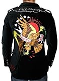 Christian Audigier has quickly become Rock Royalty through the tattoo designs of Ed Hardy. Celebrate who you are with this regal rock and roll with soul blazer. This military inspired jacket features four front pockets, Ed Hardy logo buttons, and a tattoo inspired snake embroidered on the right chest. The right sleeve features the Ed Hardy logo embroidery detail, the left sleeve is embellished with a full length embroidered design including the words "Death Before Dishonor". The back features a large tattoo inspired graphic embroidery. This jacket is fully lined with Ed Hardy signature fabric. 100% Cotton. Hand wash, lay flat to dry. Size S- Chest 21", Length 31", Sleeve 25". Size M- Chest 22", Length 31.5", Sleeve 25.5". Size L- Chest 23", Length 32", Sleeve 26". Size XL- Chest 24", Length 32.5", Sleeve 26.5" Size 2XL- Chest 25", Length 33", Sleeve 27". Measurements taken laying flat. Style # ENJM5021..../ ED HARDY Christian Audigier Born Free Eagle Mens Blazer Sportcoat Sz S / Black Leather Coat